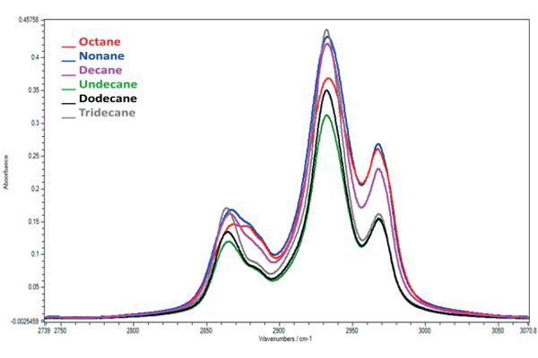 Figure 4 - Showing the overlapping spectral features of C8 to C13 n-alkanes